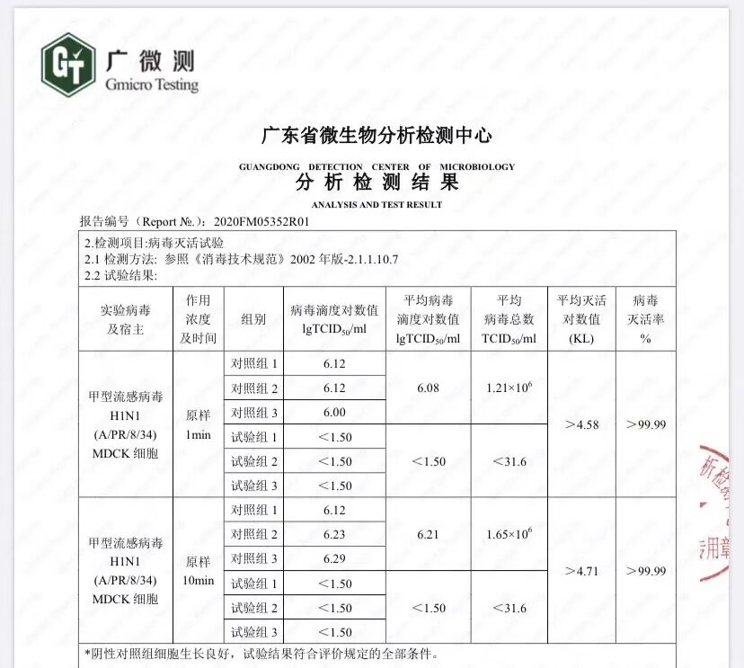 这项成果目前已获得第三方权威机构消毒效果检测报告,测试效果良好,已由合作企业珠海博纳百润生物科技有限公司委托有资质的消毒剂生产厂正式投入生产(粤卫消证字[2019]-03-第0005号)。